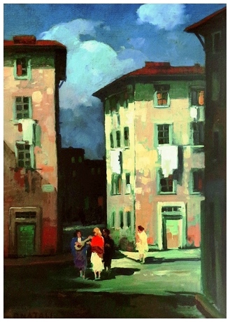 RENATO NATALI Livorno 1883 – Livorno 1979 Serenatella Olio su tavola 50,5 x 36. Firma in b. a s.; sul verso titolo e firma. A OFFERTA