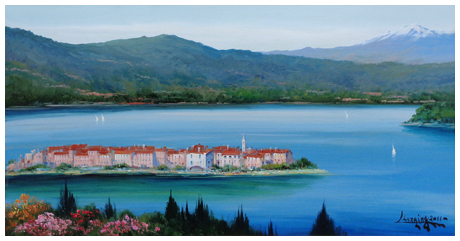 LUCIANO LUTRING Milano 1937 – Verbania 2013 Paesaggio lacustre Olio su tela 40 x 80. Firma e data in b. a d.; sul verso firma, data e titolo + etichetta e timbri dell’autore. base: 150