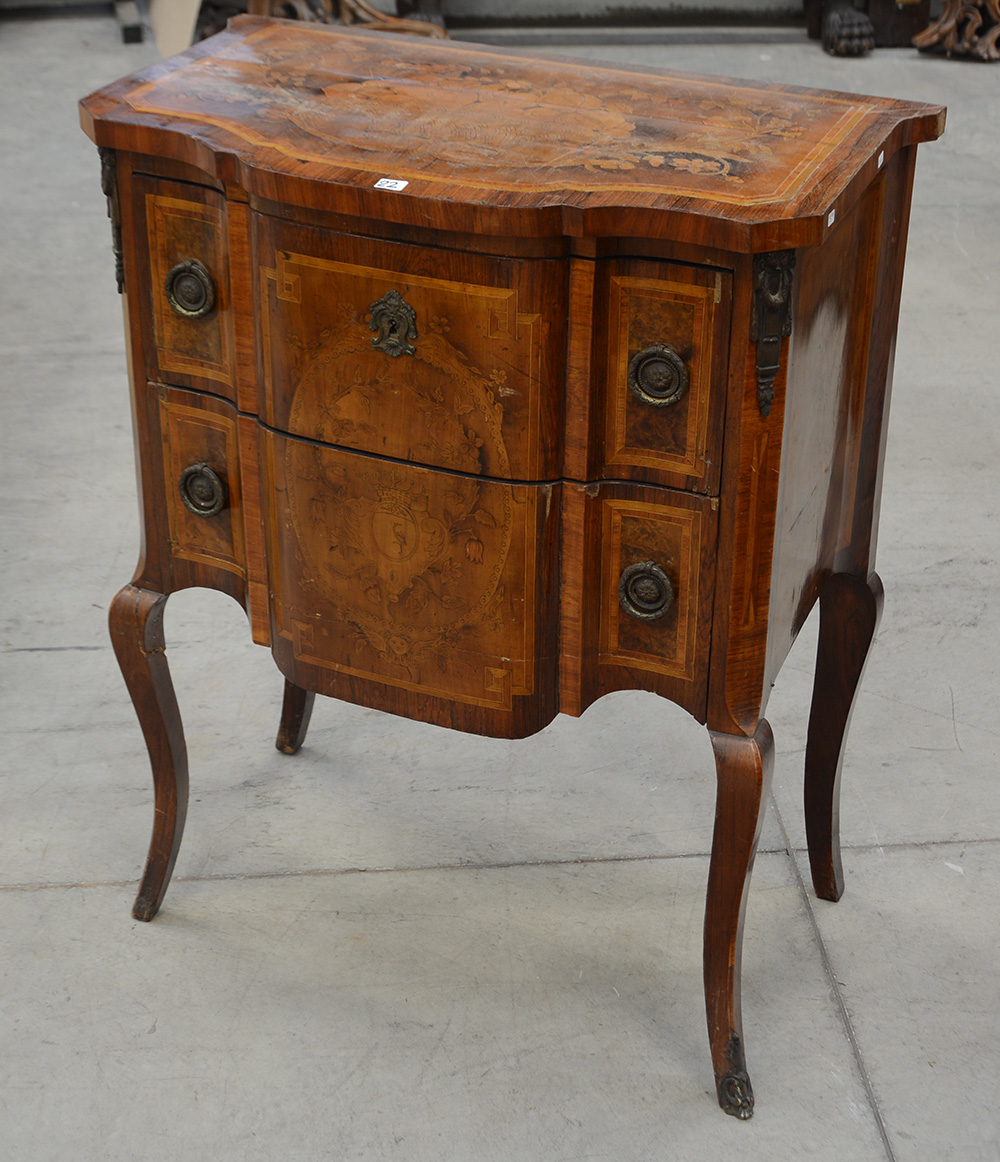 Comoncino a due cassetti con gambe e fronte moss, filettato e intarsiato a frutti e cesti di fiori (cm 72x89x42) (difetti)