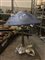 Lampada da tavolo con struttura in fusione metallica e diffusore in vetro soffiato in stampo azzurrino trasparente. Secolo XX."