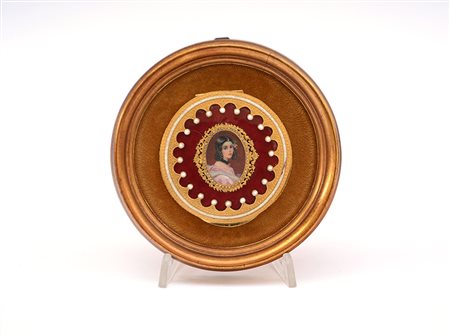 Portacipria in metallo dorato con rifiniture in madreperla e strass decorativa a motivi vegetali. Miniatura centrale raffigurante volto di donna. (cm 8x7,5) montata su cornice (difetti)