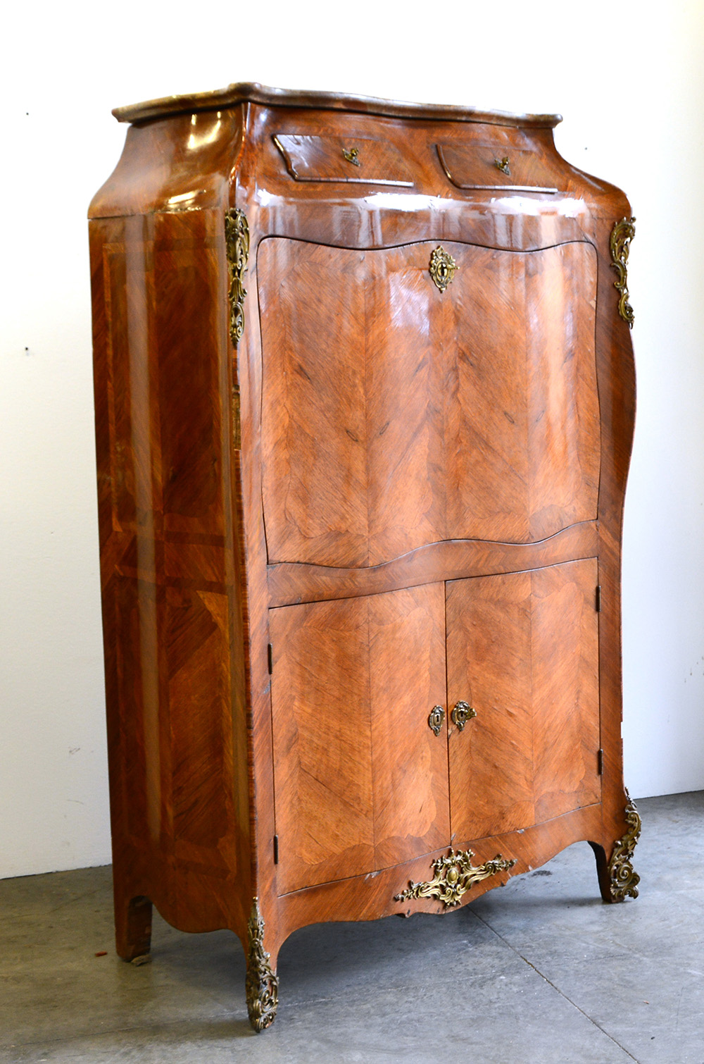 Secretaire bombato con profili aggettanti, parte inferiore a due battenti, calatoia celante cassettini e vano a giorno, parte superiore a due cassetti. Piano in marmo e guarnizioni in bronzo (cm 108x177x55) (difetti e mancanze)