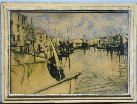 Artista di fine secolo XIX, ''Scorcio di canale con imbarcazioni'' acquerello su cartone pressato (cm 68x100) in cornice (difetti)