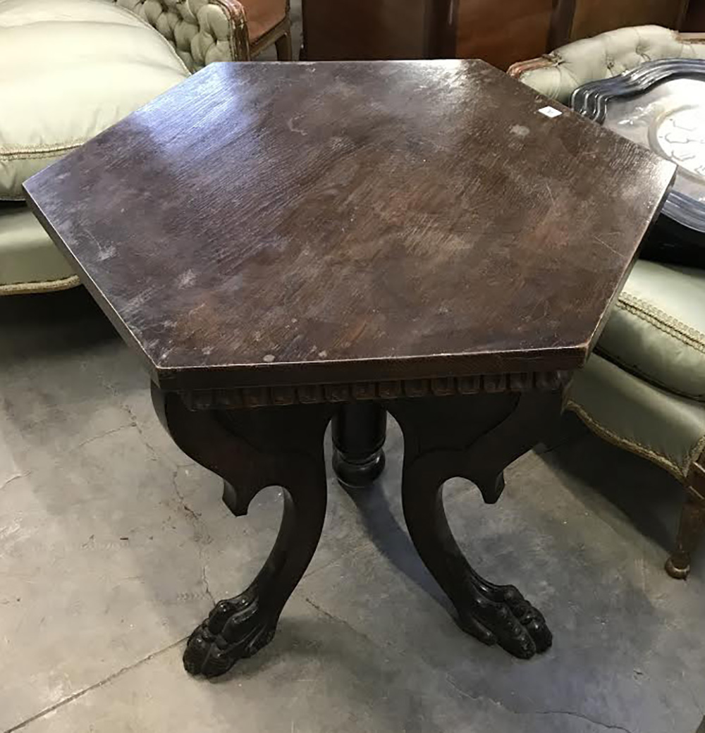 Tavolino tripode a tinta scura di gusto neo rinascimentale con gambe desinenti a zampa ferina, piano esagonale (cm 62x68x62) (lievi difetti)