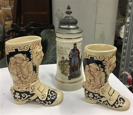 Manifattura tedesca. Lotto composto da due boccali a forma di stivale e uno con coperchio in ceramica policroma a decori diversi (difetti)