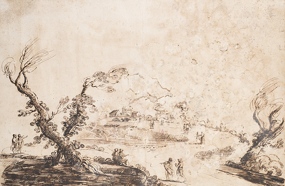 Seguace di GuercinoPaesaggio con figurePenna e inchiostro bruno su carta mm...