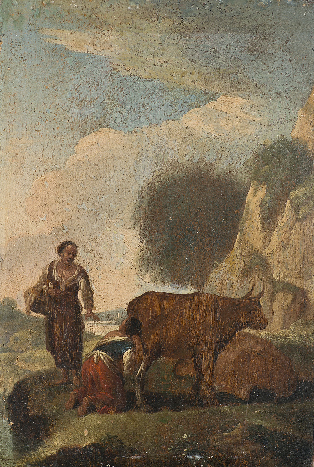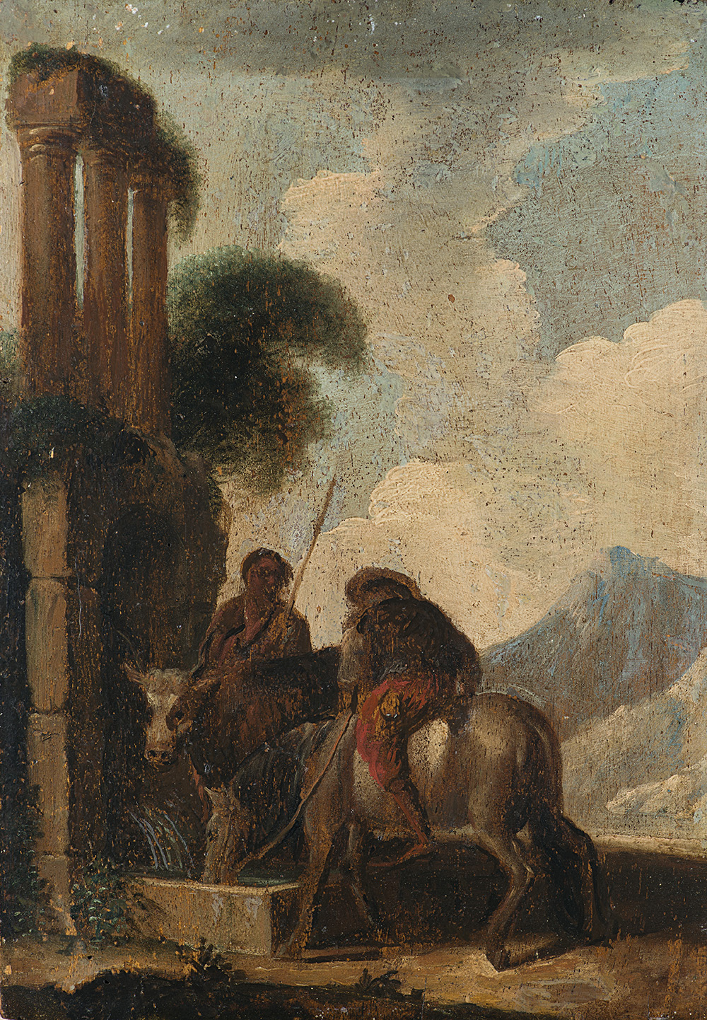 Scuola romana del secolo XVIIIViandante e pastore presso una fontanaolio su...