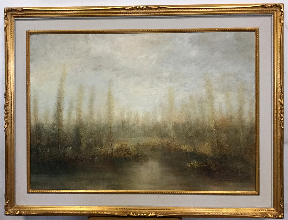 Firma indecifrata "Paesaggio lacustre" olio su compensato (cm 70x100) firmato in basso a destra, in cornice (lievi difetti)