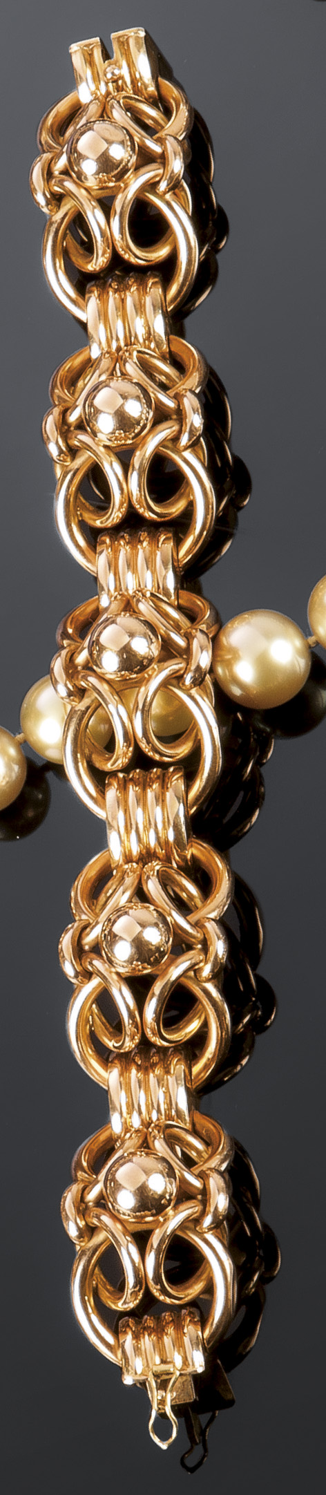 BRACCIALE Bracciale in oro giallo, anni '40, decorato con motivi ad intreccio, culminanti nella sommità in sfere Peso gr. 59