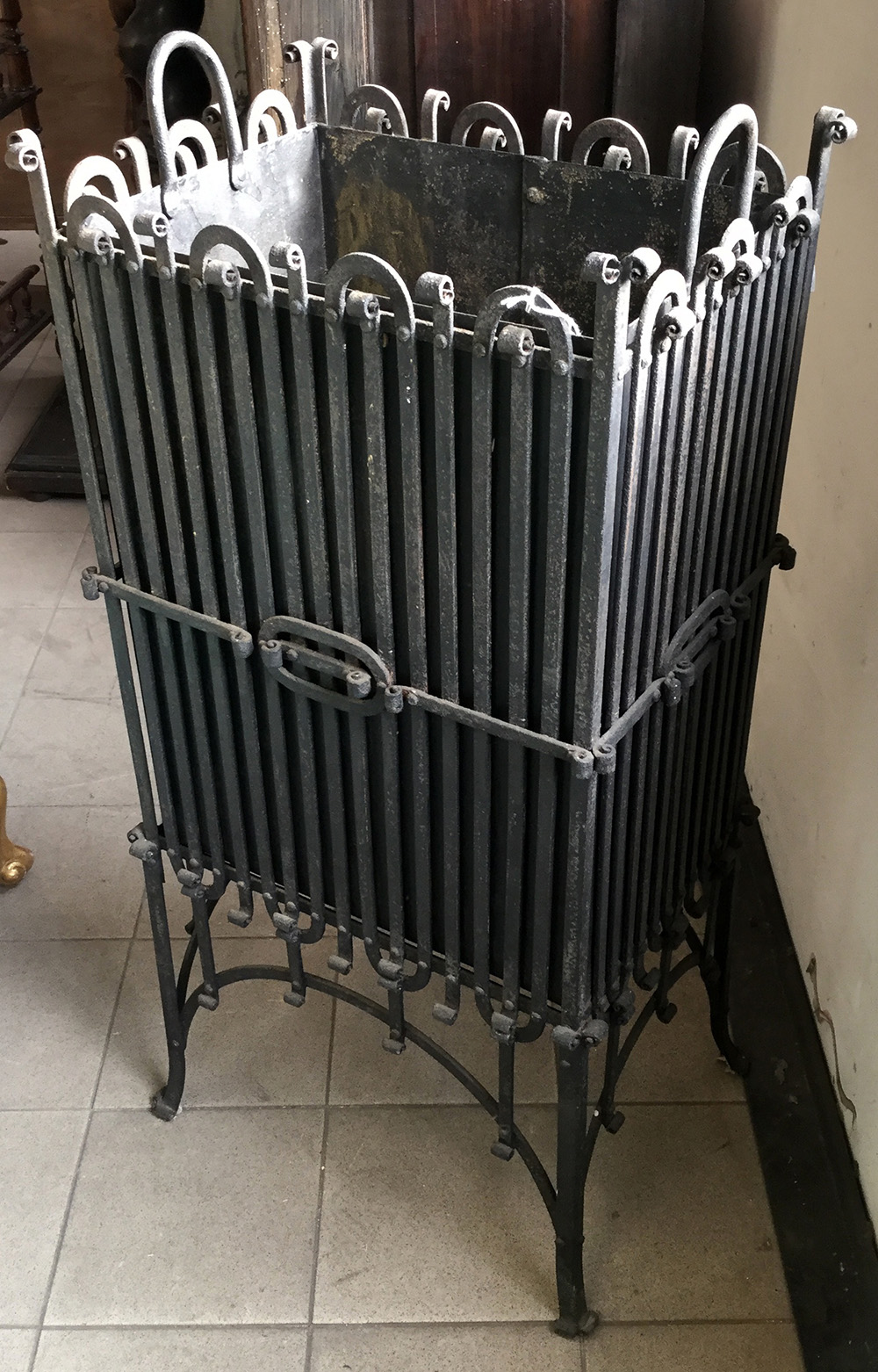 Fioriera rettangolare con struttura a ringhiera in ferro battuto (cm 40x79x29), vasca estraibile (difetti)