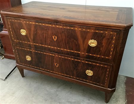 Comò a due cassetti filettati, piano con angoli smussati e gambe rastremate (cm 120x88x60) (difetti)