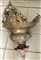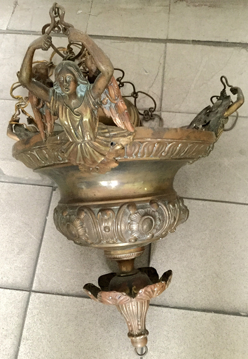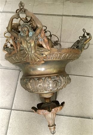 Lampada votiva in metallo sbalzato con tre angeli (difetti e mancanze)