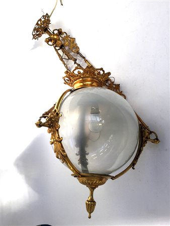Lampadario in metallo dorato con teste leonine e diffusore a boccia satinata (difetti)