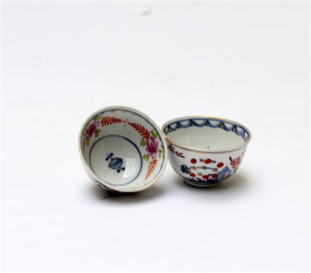 Due tazzine in porcellana decorate in policromia e dorature a fiori e volute (lievi difetti)