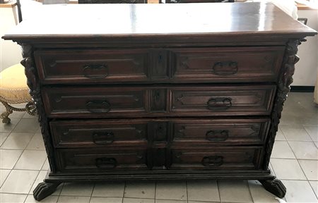 Antico comò a quattro cassetti pannellati e riquadrati in legno con montanti intagliati decorati a putti (cm 146x105x58) (difetti e restauri)