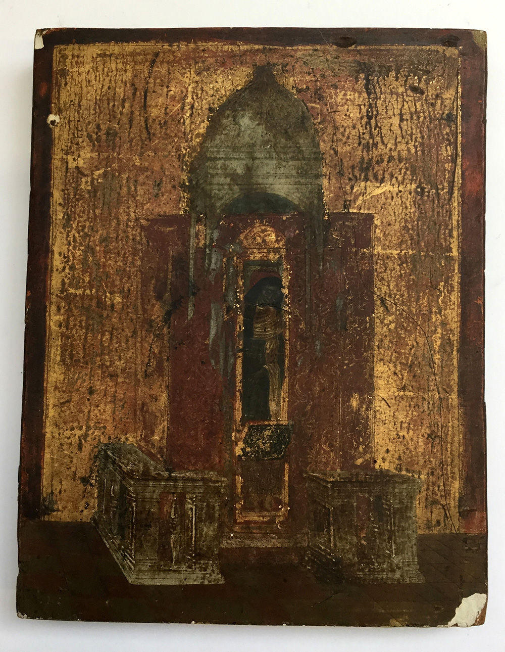 Antica icona raffigurante un interno di chiesa con figura di santa, olio su tavola (cm 24,5x19)