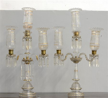 Coppia di candelieri a tre fiamme in vetro e cristallo. Basi circolari e paralumi incisi all'acido a motivi floreali (h cm 88) (difetti)