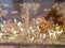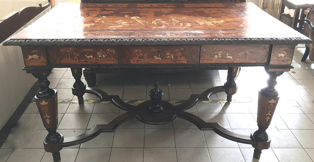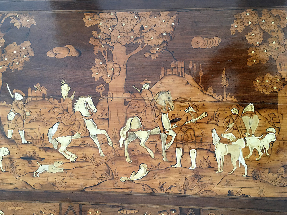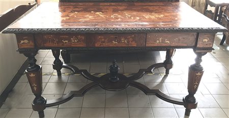Scrittoio a quattro gambe riunite da traverse con cassettino sottopiano in legno intagliato e intarsiato in avorio decorato con scene di caccia (cm 140x77x85) (difetti)
