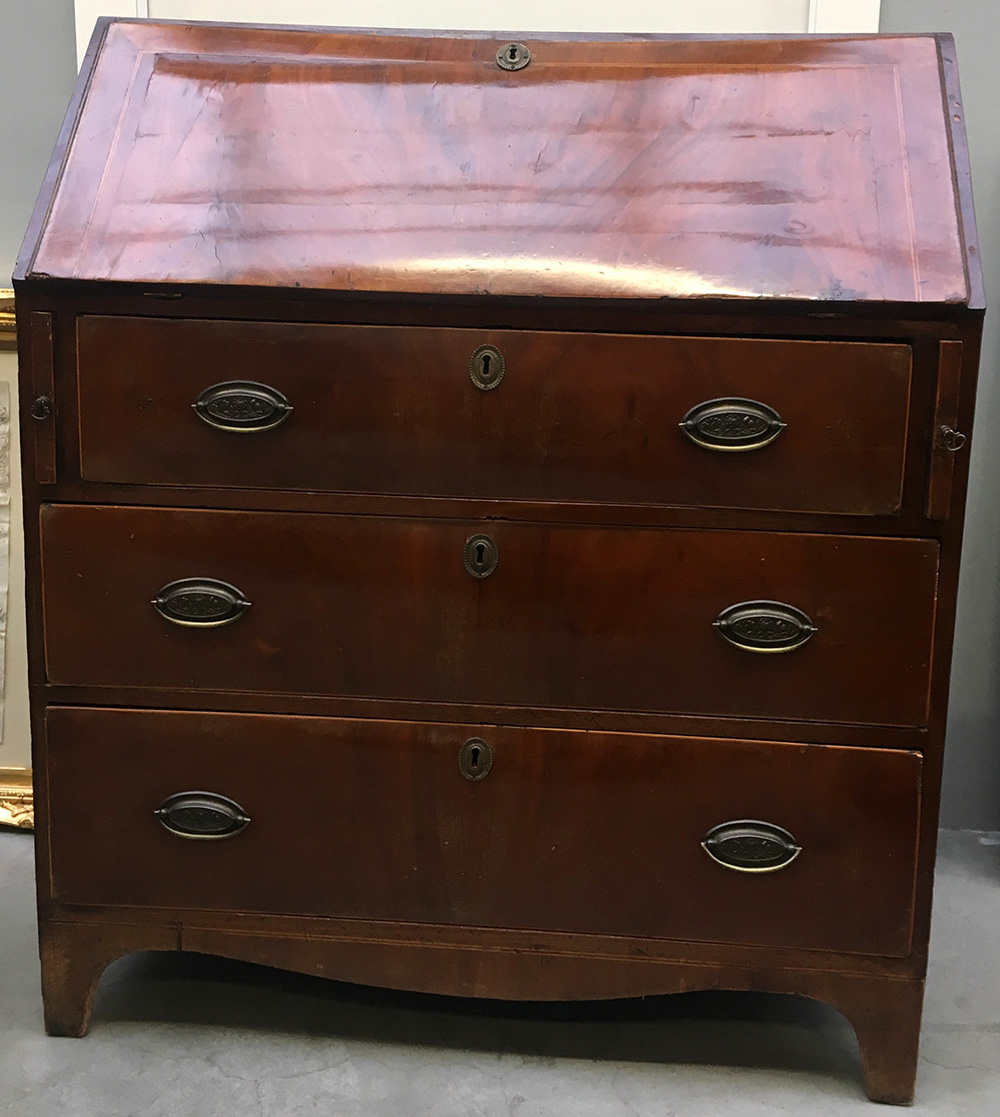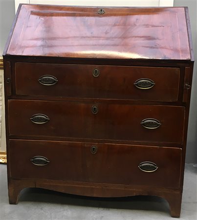 Ribalta lastronata e filettata in legno chiaro a tre cassetti, scarabattolo a vani e cassettini. Inghilterra, secolo XIX (cm 91x107x50) (difetti e mancanze)
