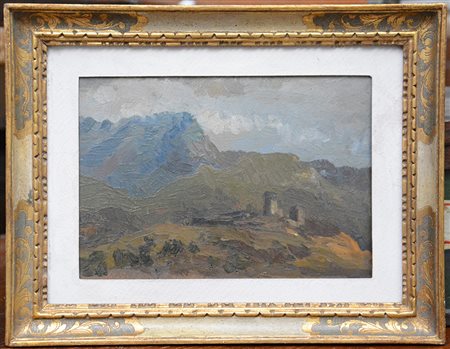 "Monte Jovet" olio su cartoncino (cm 14,5x22) firmato in basso a sinistra, firmato e titolato al retro, in cornice (firma apocrifa, difetti)