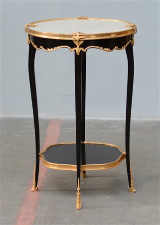Tavolino tondo a quattro gambe mosse con guarnizioni in metallo dorato e...