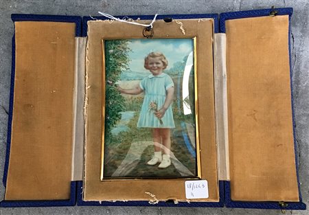 Weirs Mins (inizio secolo XX), Bimba con fiori in un paesaggio. Foto miniatura su avoriolina (cm 15,5x10) Firmata in basso a destra. In custodia (difetti)