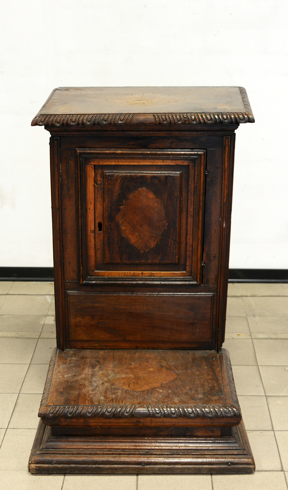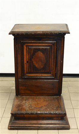 Antico inginocchiatoio con fronte, fianchi e coperchio intarsiati a motivi...