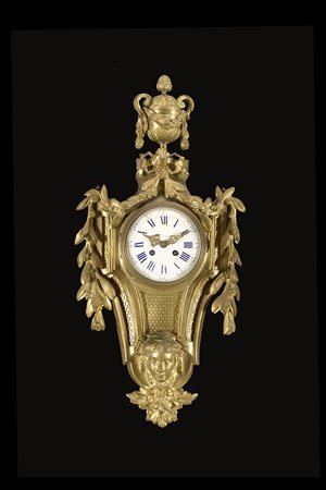 Orologio cartel in bronzo con decoro a foglie e volto femminile, in stile Luigi XVI