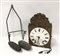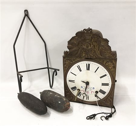 Orologio morbier con quadrante in metallo sbalzato e smalto con numeri romani, movimento con carica settimanale a pesi, suoneria delle ore con botta e ribotta(difetti)