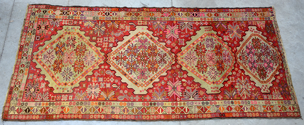 Disegno a quattro medaglioni romboidali verde chiaro su fondo rosso (cm 287x139) (difetti)