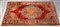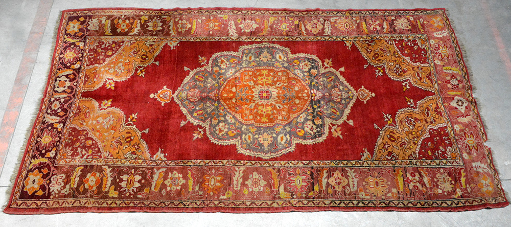 Disegno a medaglione polilobato nei toni del grigio, azzurro e arancio su campo color rubino (cm 279x175) (difetti e mancanze )