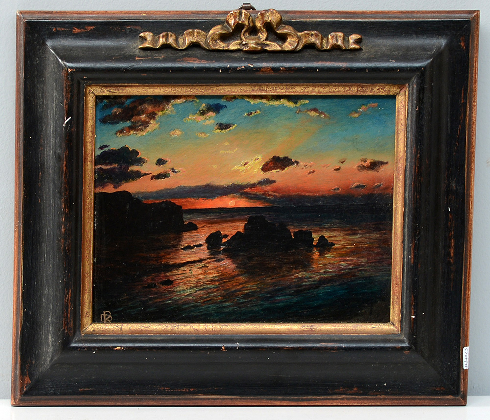 Ignoto "Tramonto marino" olio su faesite (cm 18,5x24,5) siglato RD in basso a sinistra, in cornice