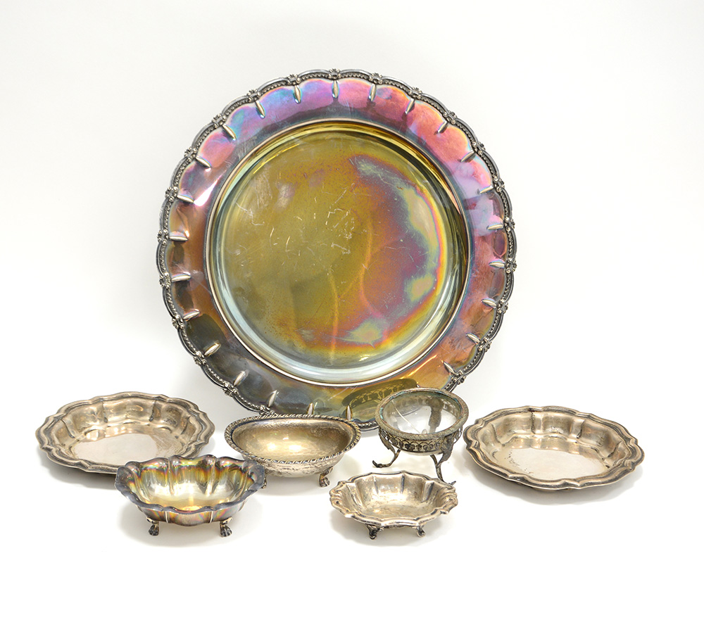 Lotto composto da un piatto, due ciotoline, tre alzatine e 1 salierina in argento e vetro, di misure diverse (gr 1050 ca) (difetti)