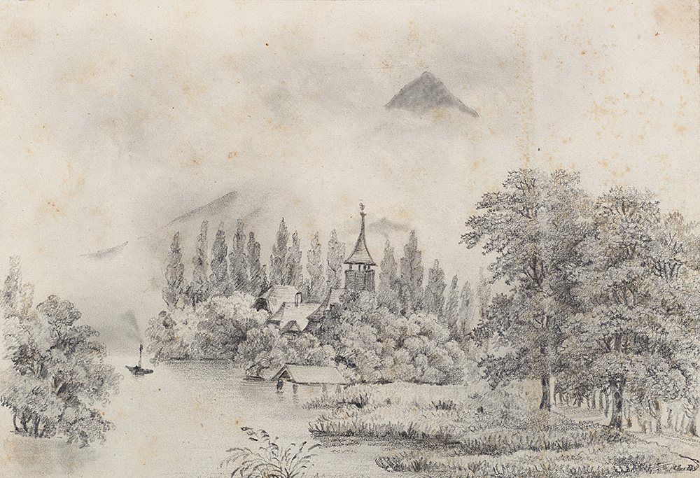 Artista del secolo XIX "Paesaggio con fiume" matita su carta applicata su un...