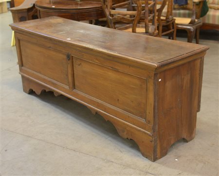 Antica cassapanca in noce con fronte riquadrata e piedi a mensola (cm...