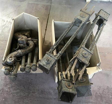 Lotto di due cartoni contenenti alcuni elementi di recinzione in ferro di differenti fatture (difetti e mancanze)