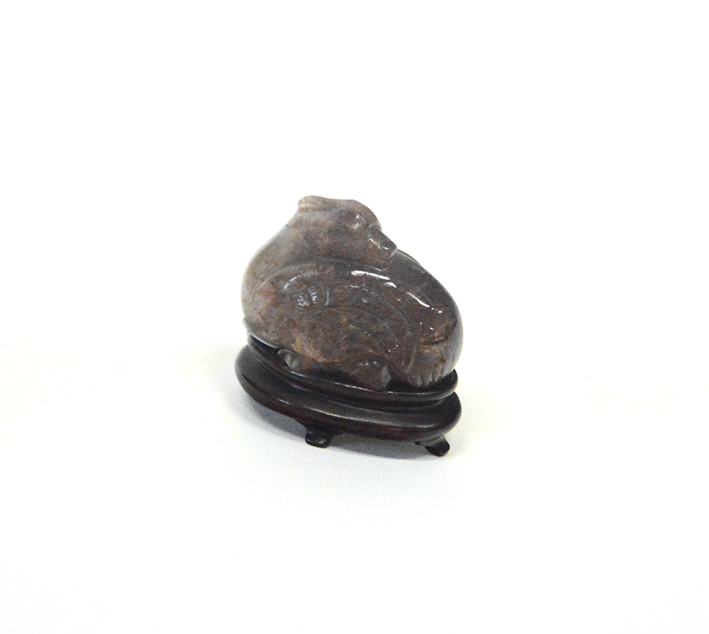 Piccola scultura in quarzo raffigurante un'anatra mandarina accovacciata, la testa poggiata sul dorso, dettagli delle piume e delle ali finemente incisi, la pietra di un colore grigio sfumato con inclusioni scure, con piccola base in legno (difetti)