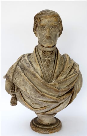 "Ritratto di Giuseppe Butti" (?) 1845. Busto in gesso (h cm 78) firmato e datato al retro (difetti e restauri)