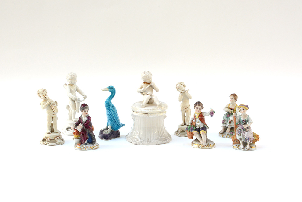 Lotto composto da quattro sculturine in porcellana policroma raffiguranti le quattro stagioni, quattro putti musicanti in ceramica bianca e una raffigurante un volatile (difetti e restauri)