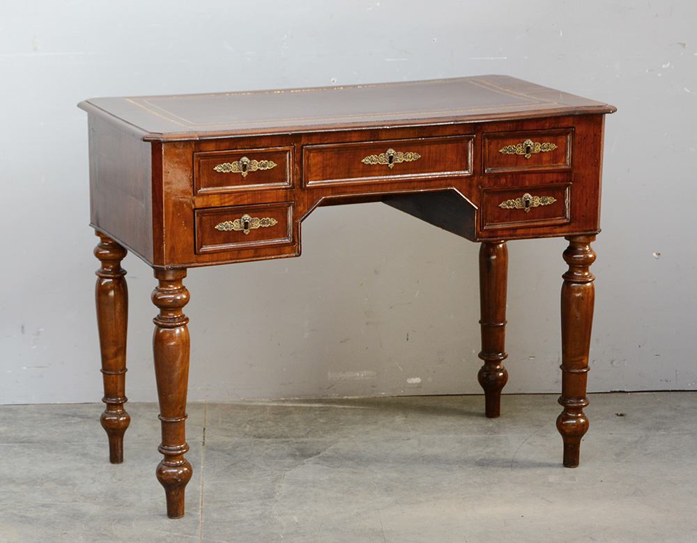 Piccolo scrittoio da centro a cinque cassettini riquadrati, gambe tornite, piano in marocchino impresso in oro, secolo XIX (cm 89x77x53)(difetti)