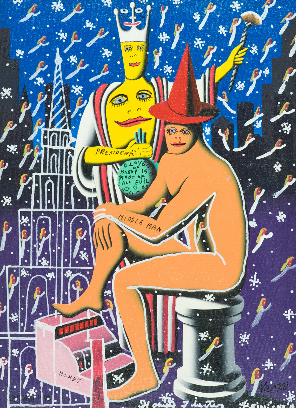 Mark Kostabi Fool's gang, 1998 - 99 Tecnica mista su tela, cm. 61x46 Firmato...