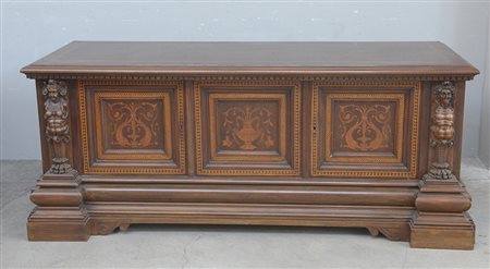 Credenza bassa a tre ante intarsiate a volute e vaso fiorito, montanti scolpiti a figure femminili(cm 180x76x60)
