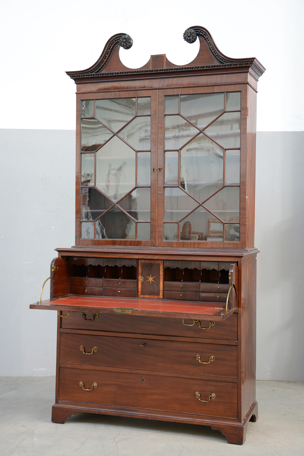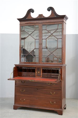 Libreria a due corpi in mogano, parte superiore a due ante a vetri decorate a listelli, parte inferiore a due finti cassetti celante calatoia con con all'interno cassettini, vani e sportello e tre grandi cassetti sul fronte. Cimasa sagomata e intagliata. Piedi a mensola. Inghilterra fine sec. XIX (difetti e mancanze)(cm 124x255x59)
