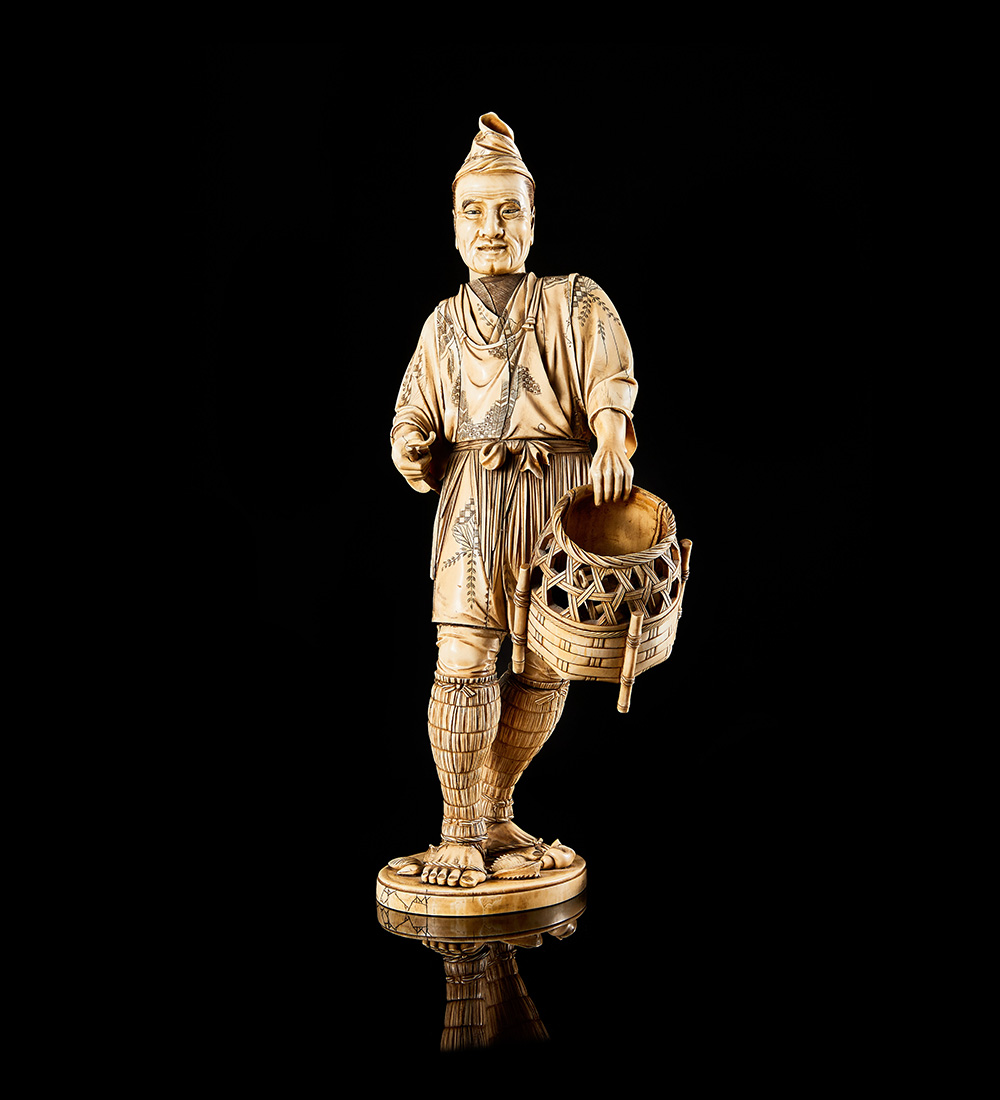 An ivory sculpture of a fisherman, with seal to the base (flaws and losses)