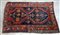 Disegno con due medaglioni a fondo blu su campo rosso. Bordura a foglie dentate e rosette (cm 200x135) (difetti e restauri)