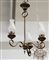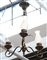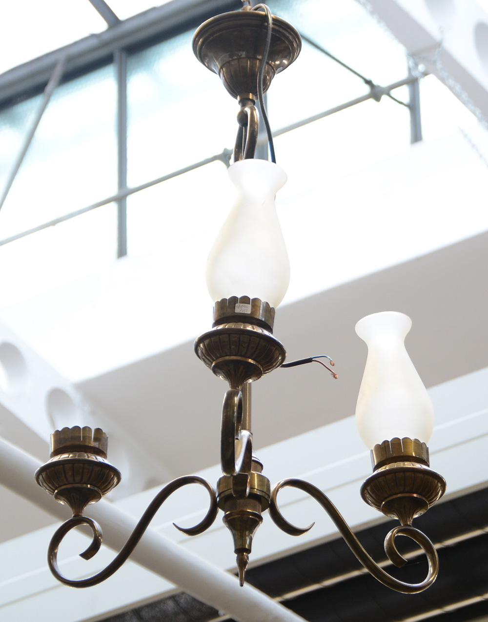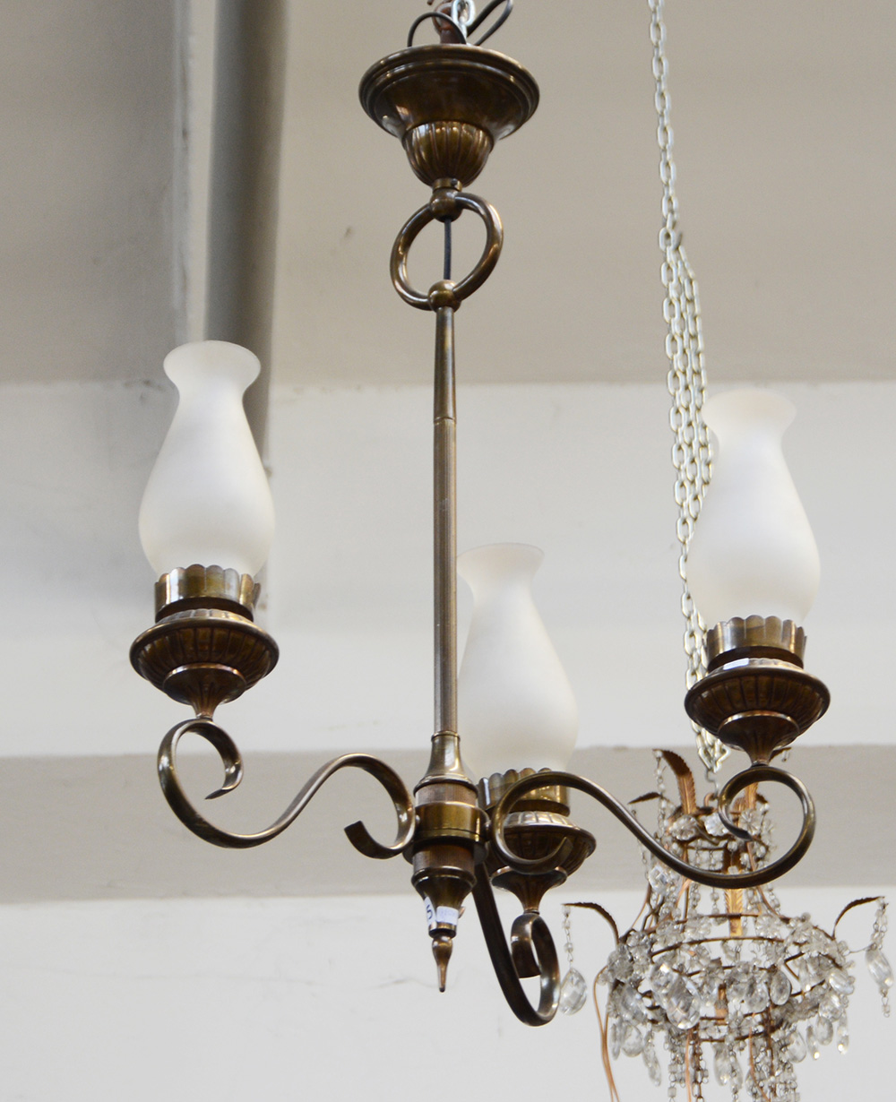 Coppia di lampadari a tre luci in ottone con braccia sagomate con cinque paralumi in vetro (difetti)