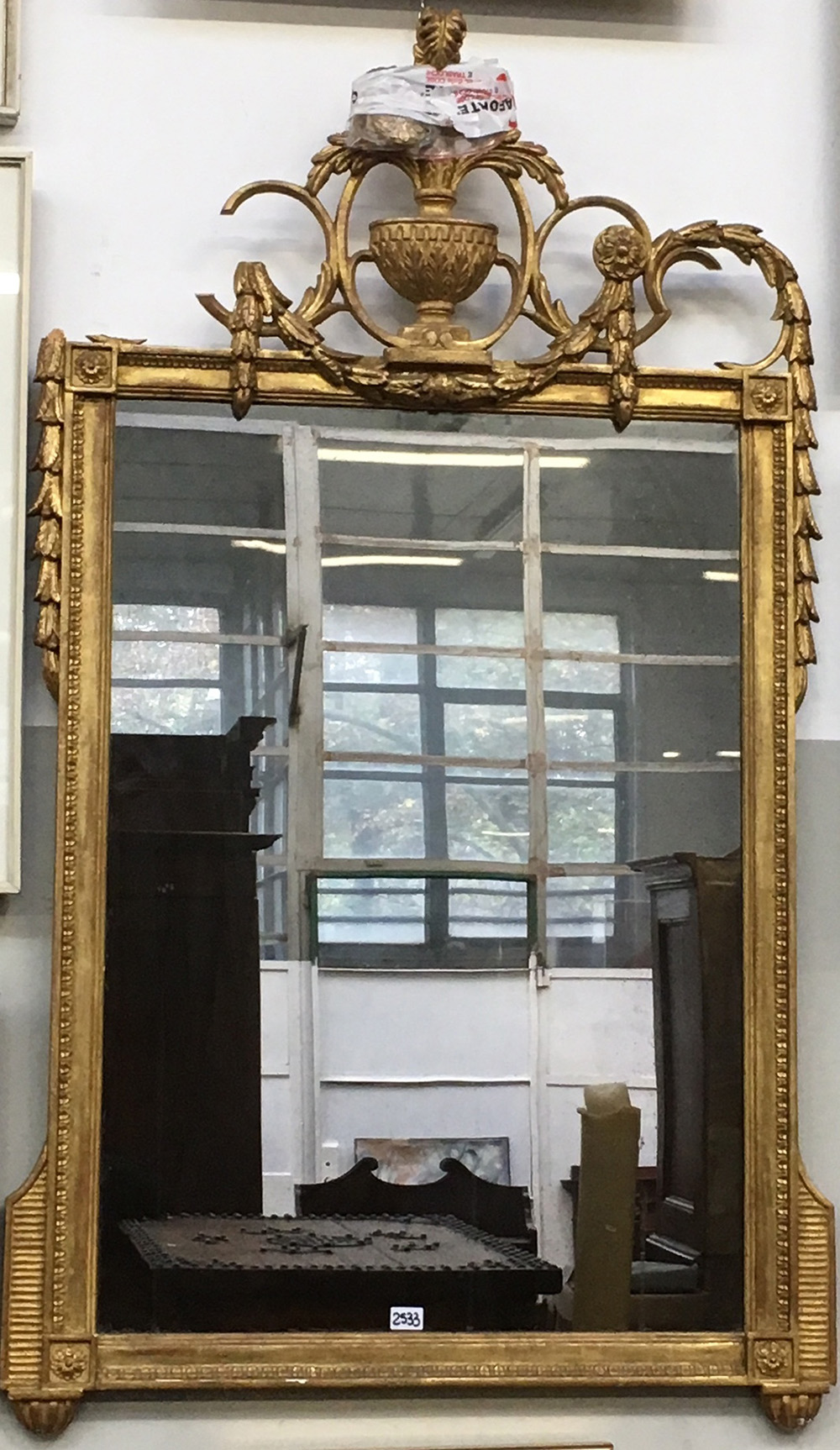 Specchiera rettangolare in legno dorato con cimasa intagliata e traforata a vaso di fiori e volute (cm 122x70)(difetti)
