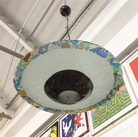 Lampada a sospensione con paralume in vetro policromo. Italia, anni '80. (lievi difetti)