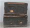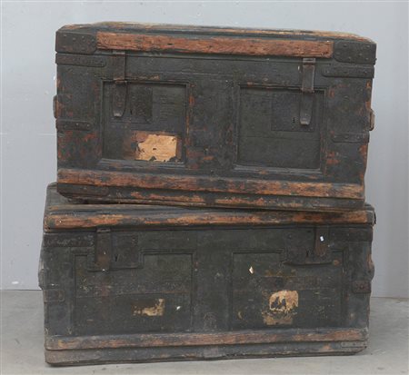 Coppia di bauli in legno laccato verde con cerniere in metallo, secolo XIX (difetti e mancanze)