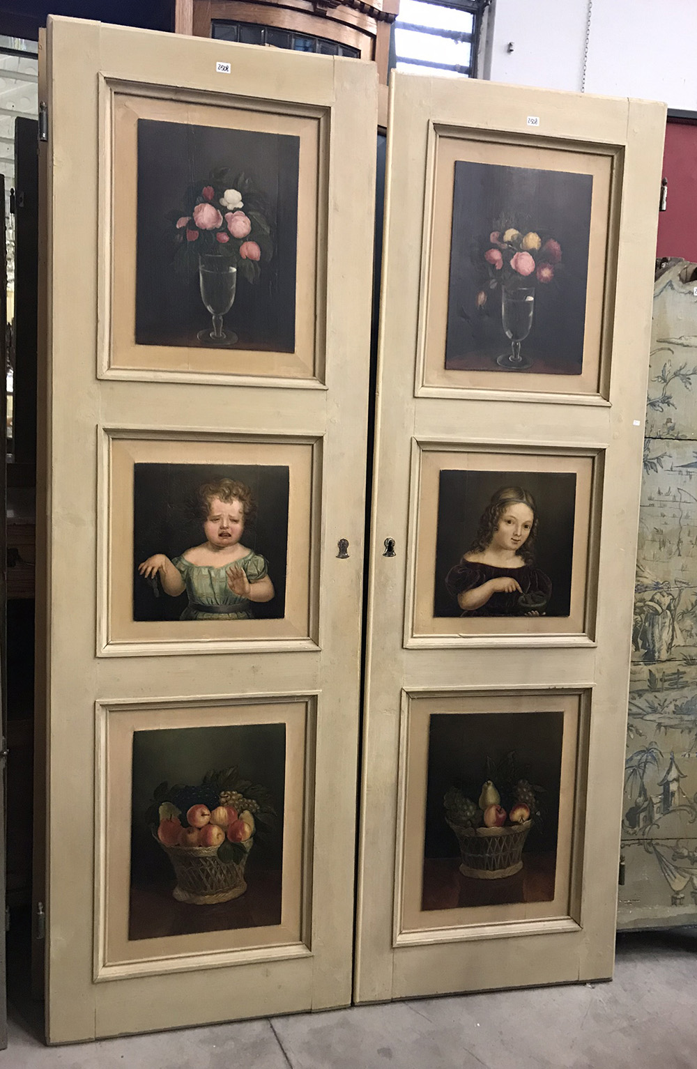 Portoncino a due ante con pannelli dipinti a cesti fioriti e fanciulle e bicchieri con fiori, secolo XIX (cm 128x20) (restauri)
